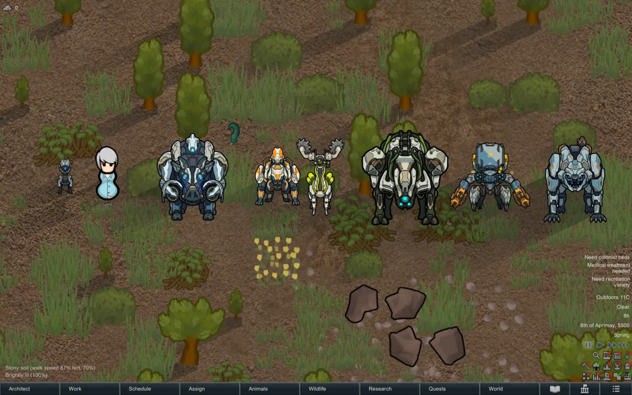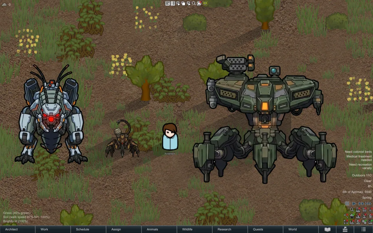 They are Archotech infrastructure — harvesters, scouts, siege platforms — seeded on this world centuries before your ship broke apart on entry. Whatever directed them has long since gone silent. The machines have not.