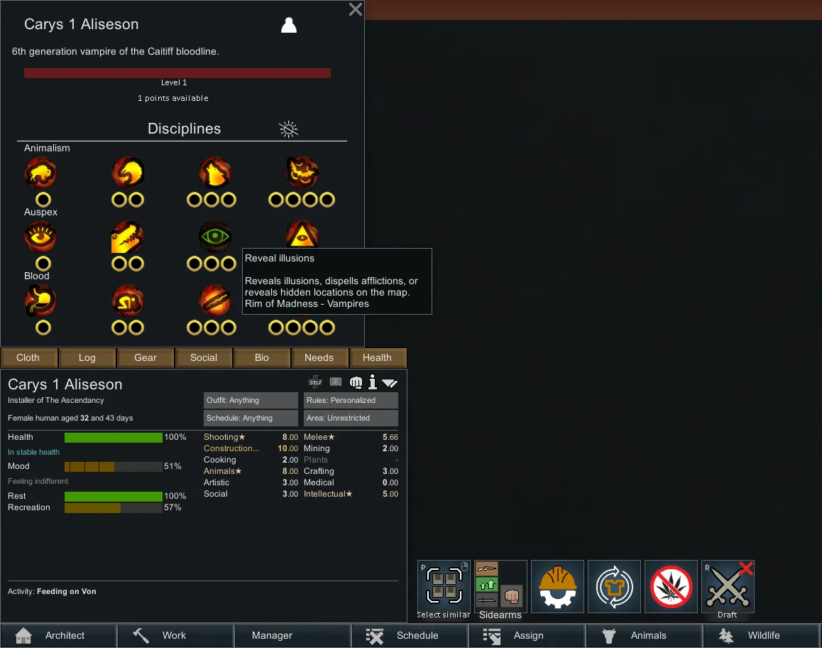 [i]I have not tested how the UI will deal with having so many disciplines. if your Caitiff learns every discipline over the course of your play through, expect unusual behavior. Please let me know if there is a UI problem, or some kind of limit on the number of abilities which can be displayed, and I'll see what I can do about fixing it.[/i]