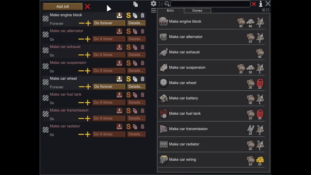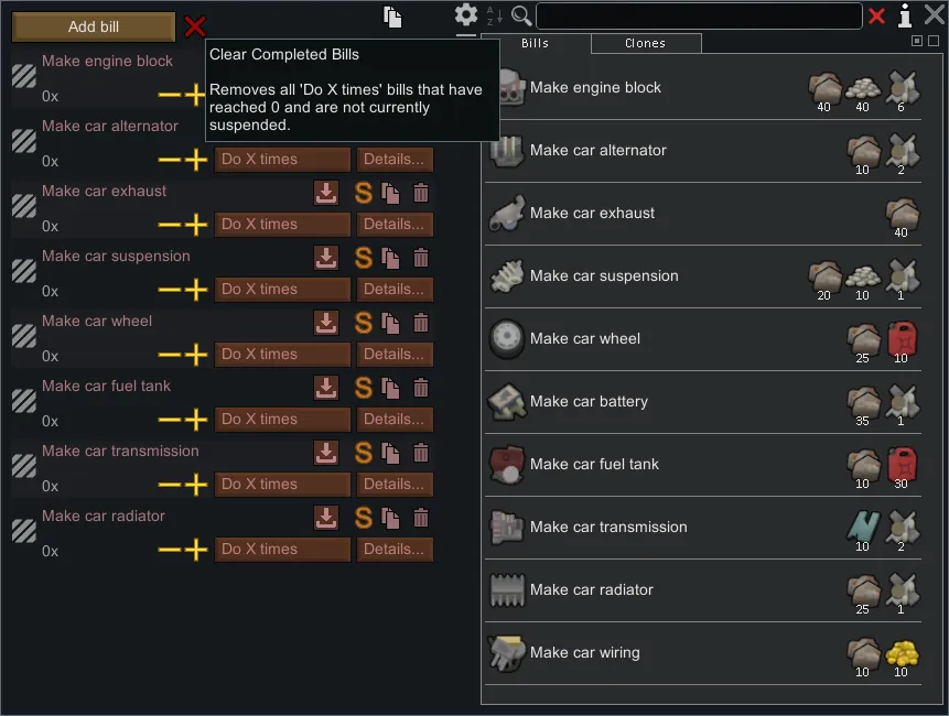 This tool is designed to reduce UI clutter without affecting active "Do forever" or "Do until X" bills. The mod now includes full localization support for the UI and feedback messages. The icon in the game also has a tooltip that explains what the button does.