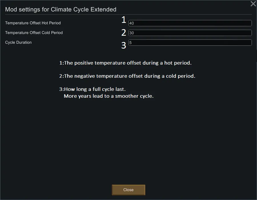 With these settings on a tile with a base average temperature of -10° to 25° you would get hot years from 30° to 65° and cold years from -50° to -15°.