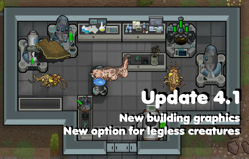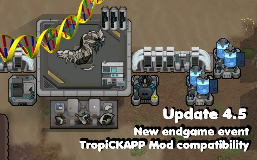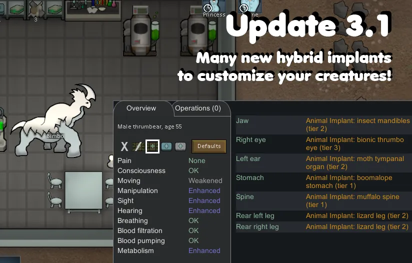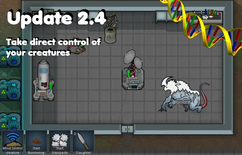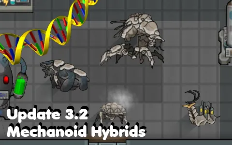 - Hybridization: Extract genes from Bears, Cats, Chickens, Boomalopes, Muffalos, Wolves, Rodents, Reptiles, Insectoids, Thrumbos and Mechanoids, and create hybrids of these species. Some combinations can go both ways, so for example a bearalope is different from a boombear, and you will get one at random. A total of 77 new creatures for you to play with. Some very useful, others... less so.