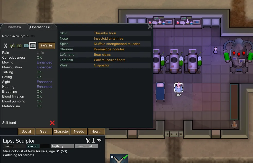 - Hybrid implants: The Growth Vat can be used to create either animal or human implants. Using different animal genes, you can create implants such as Thrumbo Legs, or Chitinous Hearts, and turn your scientific aberrations into even more bizarre creatures. By using humanoid genes, you can mix them with animal genes and create several hybrid implants to improve your colonists.