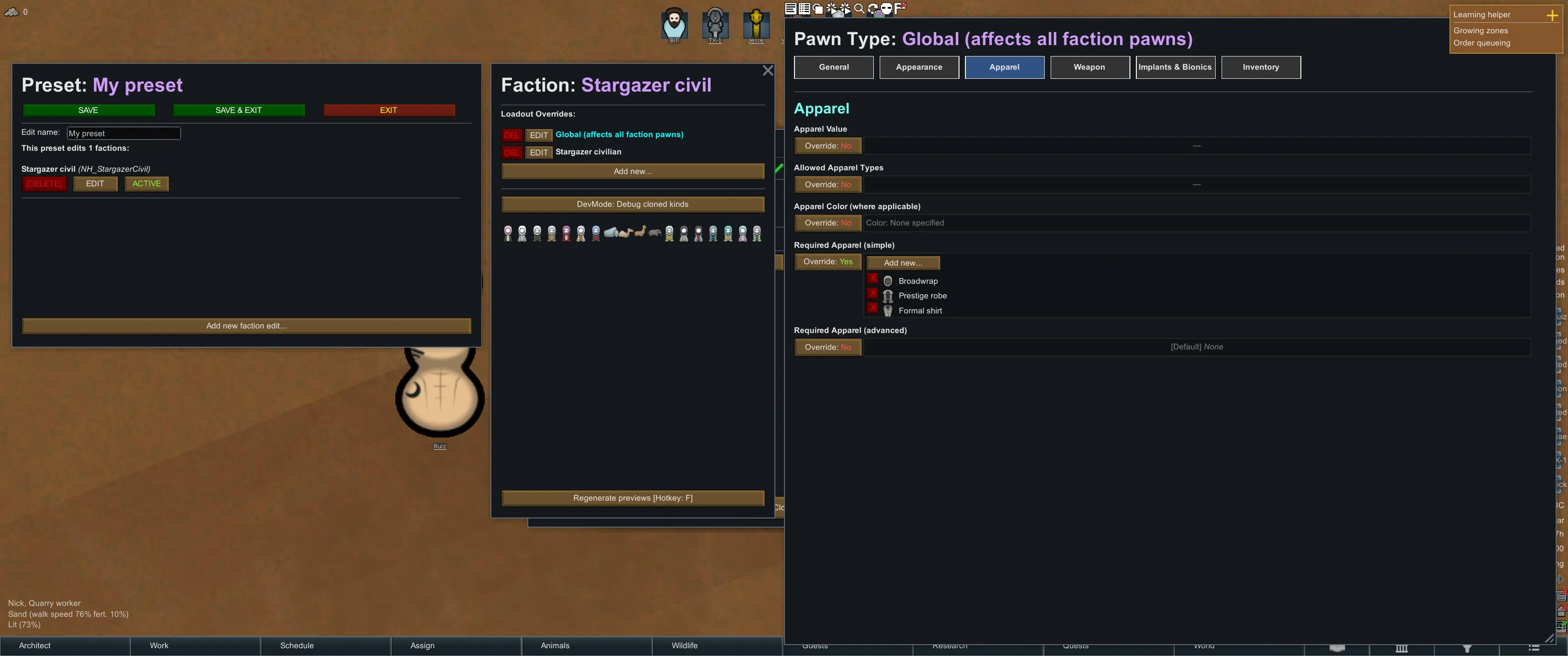 - Specify role names, apparel types, hair types, weapon types, set colors, change caravan animals and more per pawnkind per faction