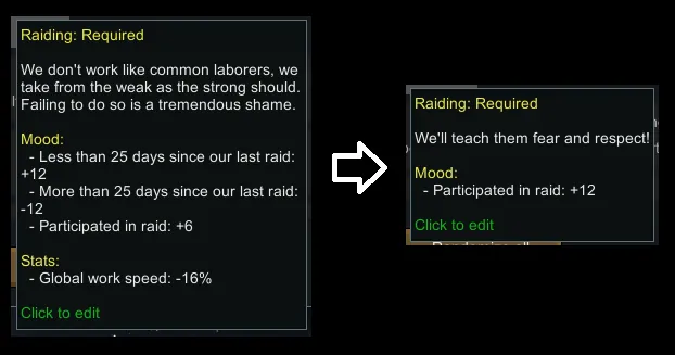 - Raiders will gain a mood buff for participating in a raid. +6 for Respected and a whopping +12 for Required!
