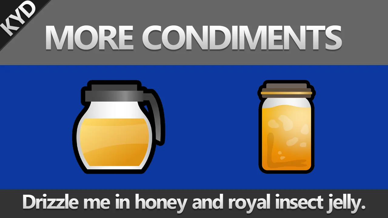 Adds two new condiments for use in Vanilla Cooking Expanded or [url=https://steamcommunity.com/sharedfiles/filedetails/?id=2455755633]Sauced Meals[/url] recipes to add some more uses to a few items I find myself drowning in.
