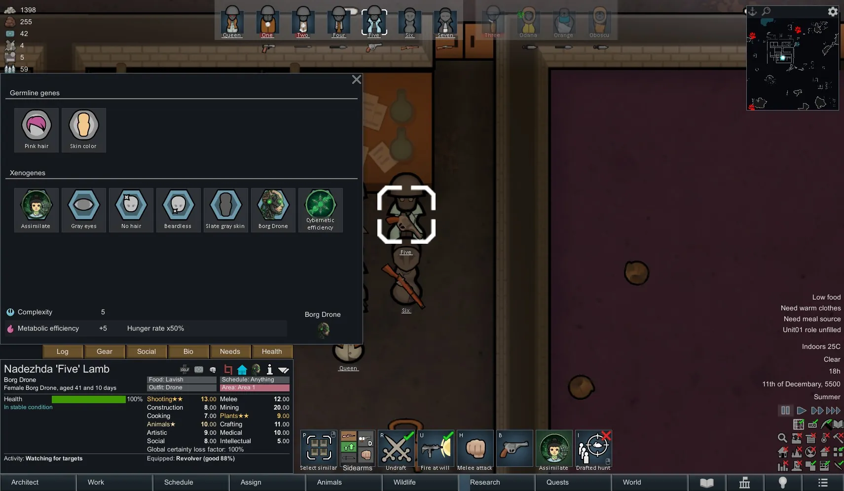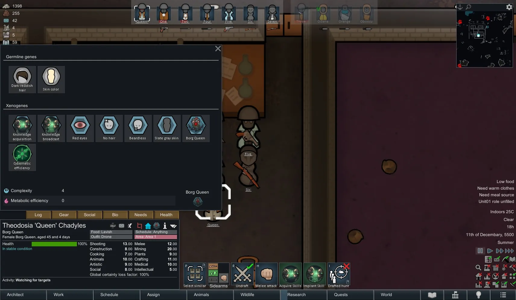 [*] The Queen uses "Neurosync Stats" on Drone 2, the Queen and Drone 2 now has 12 Melee, 11 Range, and 8 Plants.