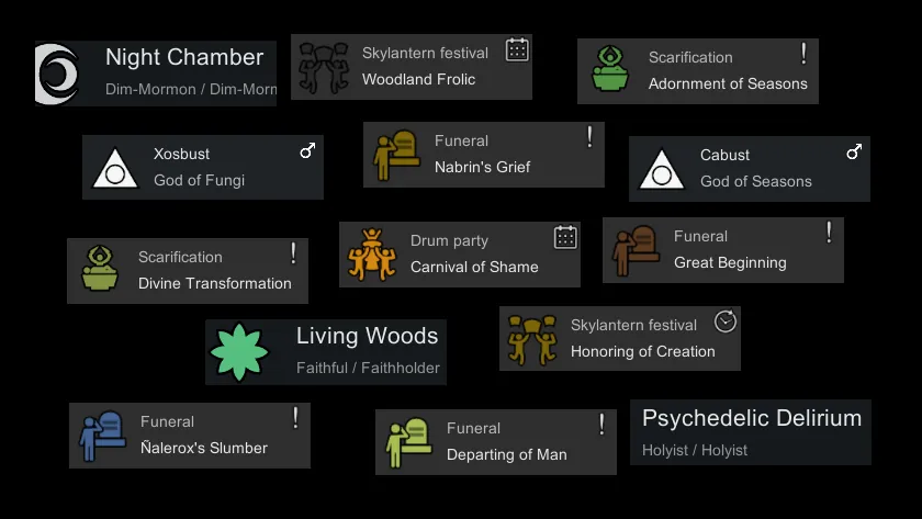 I tried to round out the word choices for funerals and scarification ceremonies in particular to better include approaches that different cultures would have to them... like ideas around death being a rebirth or transition and scarification being a positive rite of passage instead of just some dark masochist thing. This worked a little better for scarification when it didn't have the "pain is virtue" meme requirement but my patch [url=https://steamcommunity.com/sharedfiles/filedetails/?id=2648112257]Scarification for Everyone[/url] will remove that requirement if you want.