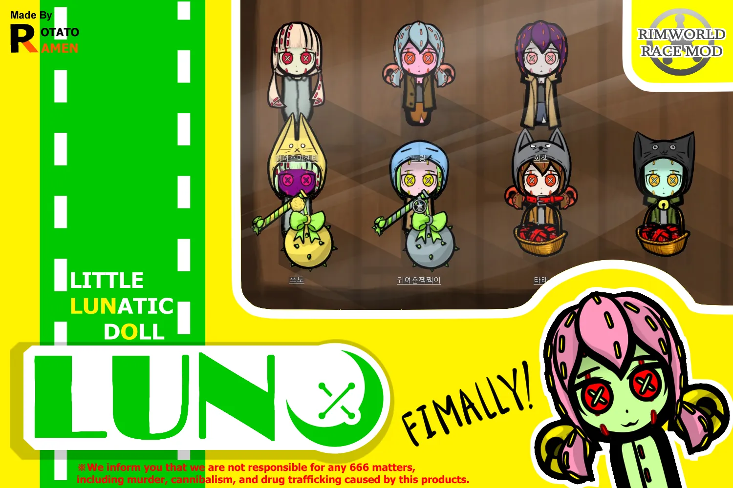 Adds 'Luno', a doll that comes to life with an unknown principle. Lunos are made of cloth, so they have small, weak bodies, but they are fast in movement, not tired without sleeping, and talented in making drugs. Also, they don't usually feel pain and don't bleed no matter how hurt they are.