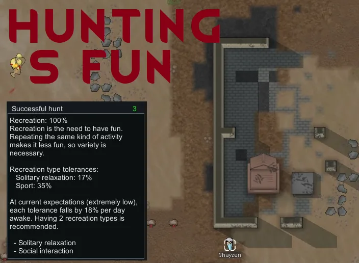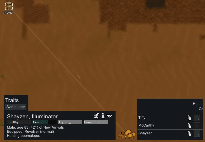 Adds an avid hunter trait to the game with associated hunting-related thoughts. Avid hunters gain recreation from hunting and will occasionally go hunting as a joy activity. When selecting targets, more skilled hunters (based on shooting and animal skills) have a greater chance of pursuing more dangerous prey. Avid hunters prefer action and will not wander sadly or in their own rooms when having a mental breakdown.