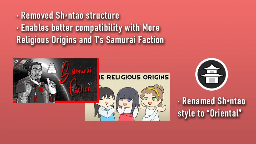 Best used with [b][url=https://steamcommunity.com/sharedfiles/filedetails/?id=2620745910]More Religious Origins[/url][/b] and/or [b][url=https://steamcommunity.com/sharedfiles/filedetails/?id=2559958496]T's Samurai Faction[/url][/b]