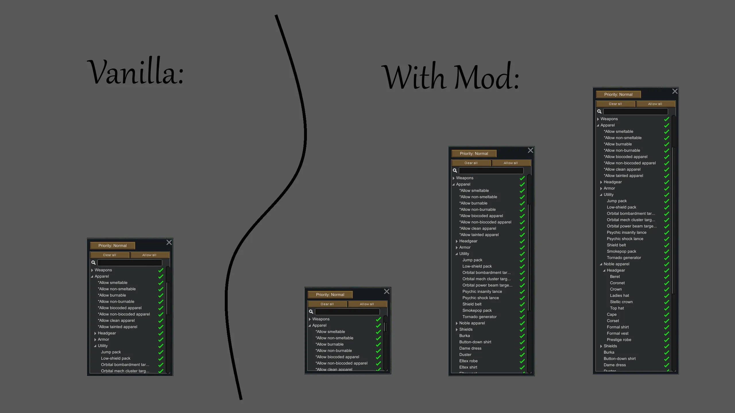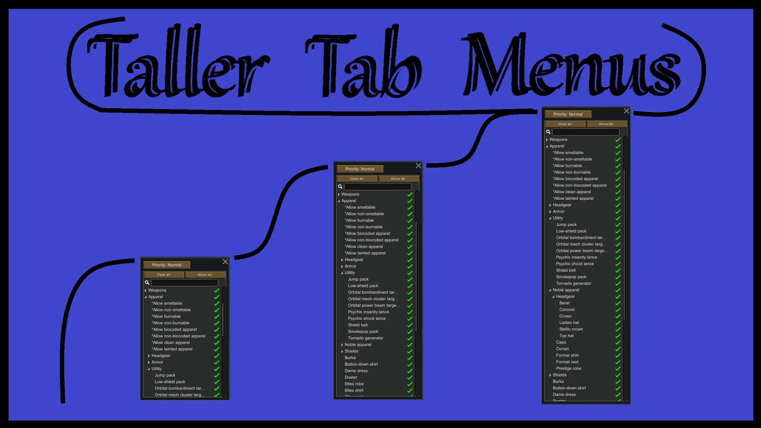 Increases the height of tab menus. Allows you to see more of the menu at once, and take advantage of higher resolutions. Currently only increases the height of the storage tab for stockpile zones. Adjustable in the settings.