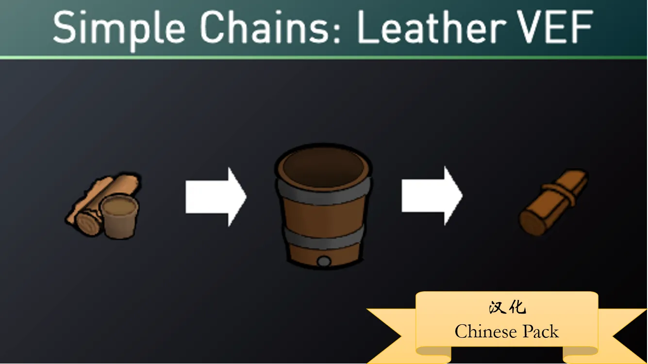 [b] Simple Chains:LeatherVEF(简化链:皮革)的简体中文补丁,请在原mod之后加载。[/b] 简介:引入皮革加工生产链,需要将毛皮鞣制,才能获得皮革 Note:this is a translation pack for chinese.
