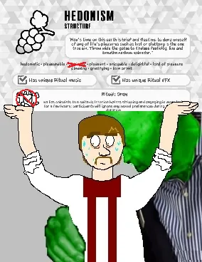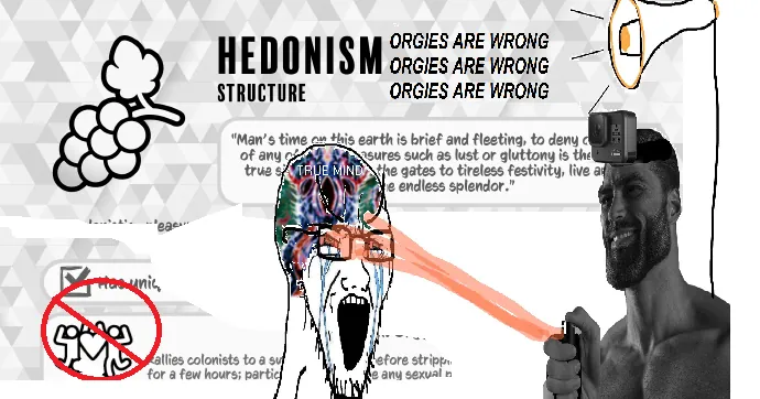 This simple Mod eliminates all references to sexual orgies from the Hedonist Structure of the new Vanilla Ideology Memes Expanded Mod. It removes the ability to commence orgies, prohibits Loving outside of the Vanilla rendition's constraints, and restrains Loving to where it belongs: in the marriage bed or, if you're a degenerate, in the bedroom. All references to Hedonism now pertain to Drug use, Free and Approved Loving, and especially gluttony.