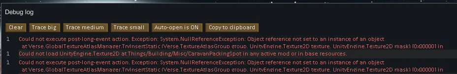 [b]Could not load UnityEngine.Texture2D at Things/Building/Misc/CaravanPackingSpot in any active mod or in base resources.[/b]