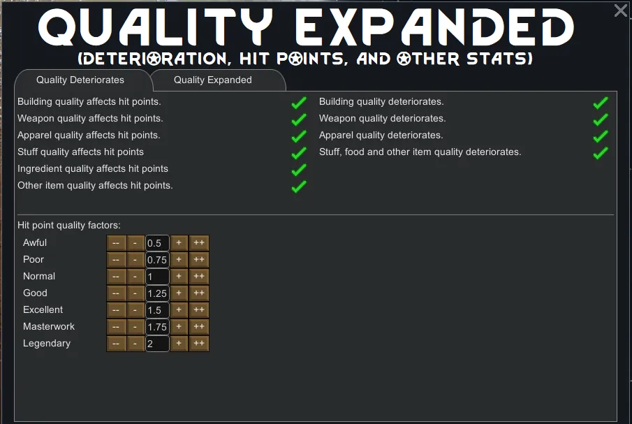 [*] Deterioration Rate (disabled by default) - It is recommended to disable this when using Quality Hit Points. Otherwise high-quality items will have higher HP in addition to losing HP slower, extending their lifespan well beyond that of vanilla.