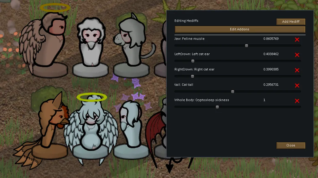 [*] For adding new hediffs, you can only select those that have hediff graphics associated with them for the race of the statue. E.g. Revia tails can only be added to Revia statues.