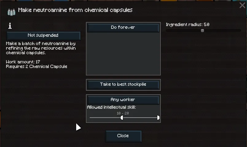Reduces the amount of work needed to make neutroamine from chemical capsules from 2000t to 1000t (34s to 17s), makes the crafting speed based on the drug synthesis speed instead of general labor speed and crafting increases the crafter's Intellectual skill.