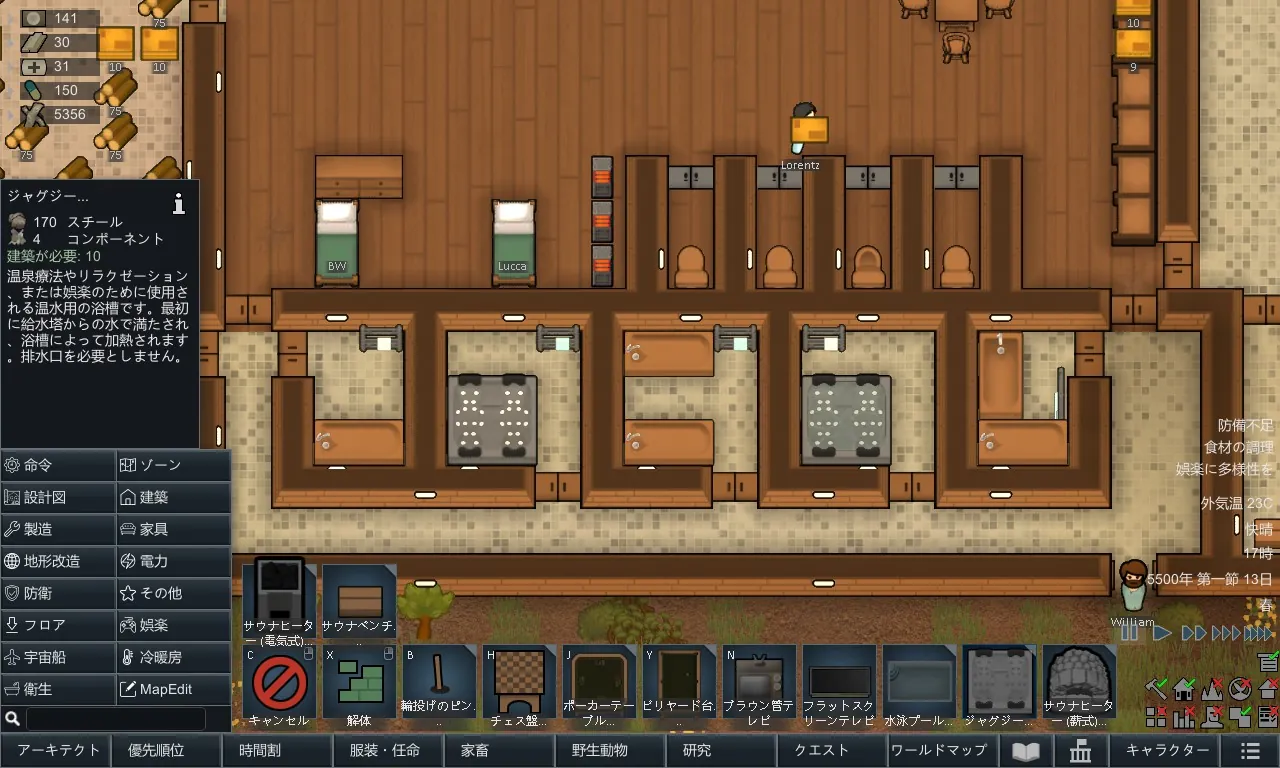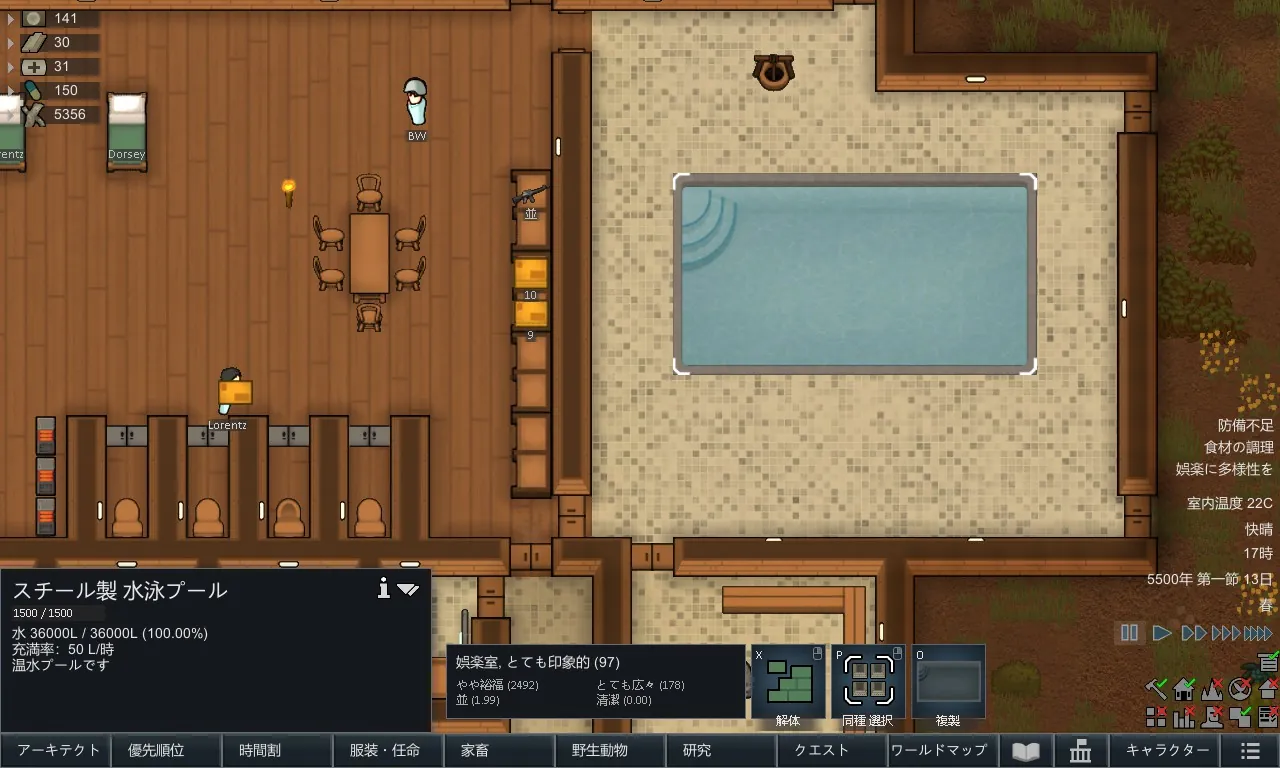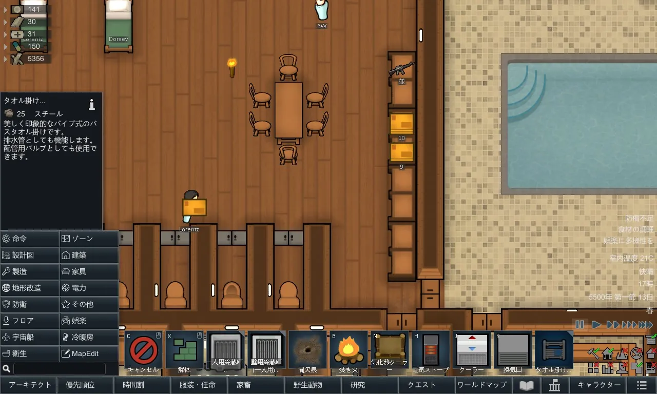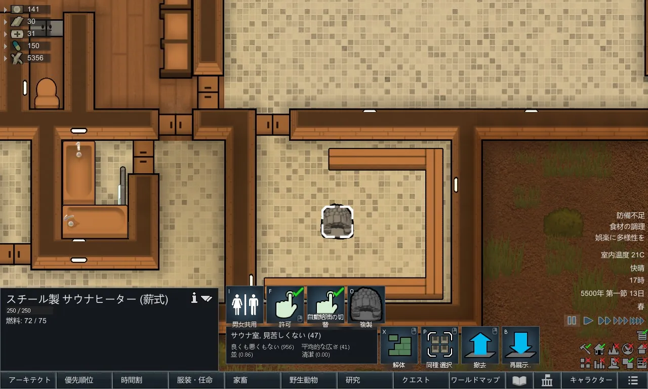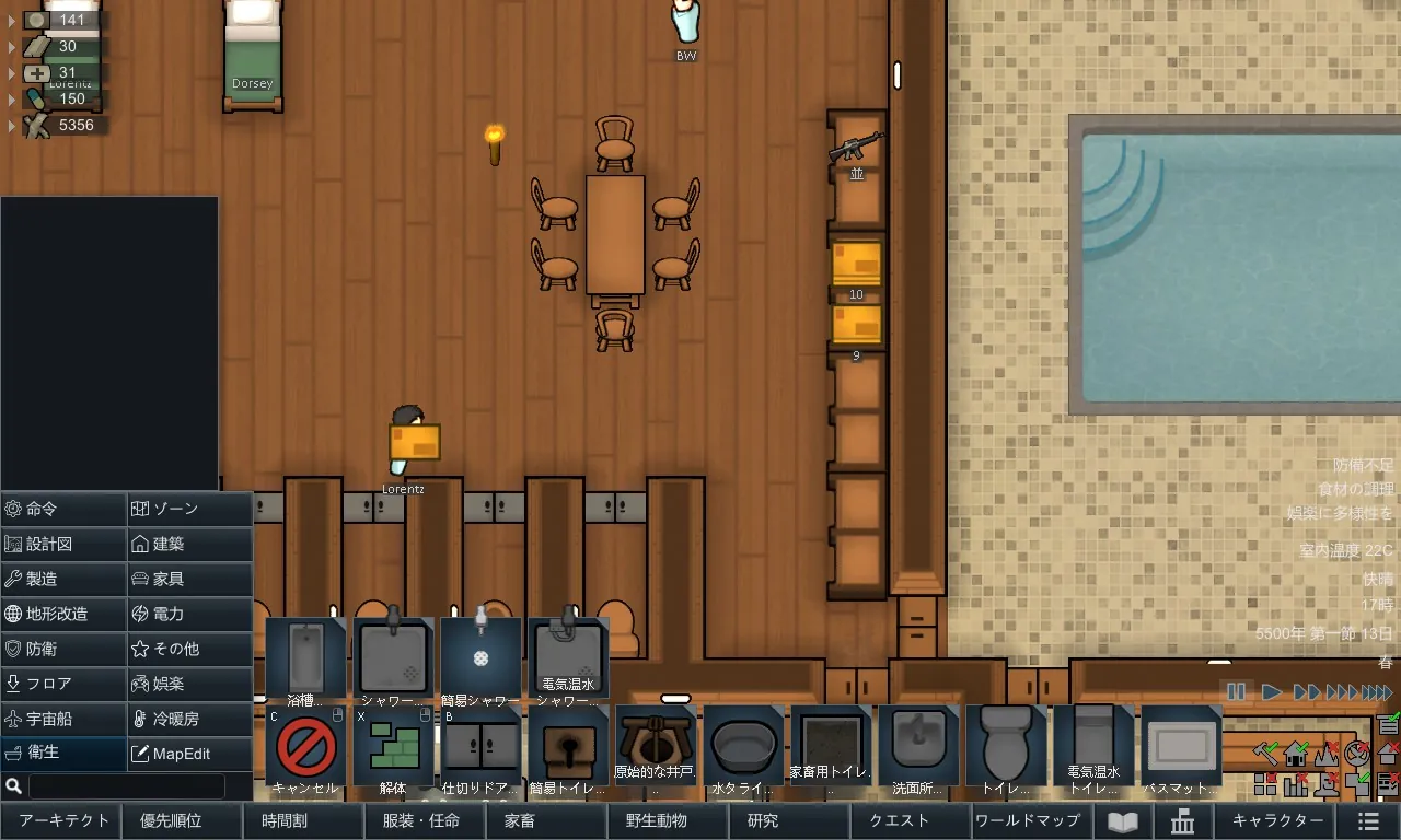 入植者(とポーン)は、コロニーや自室の外にいるとき、膀胱の欲求に応じて、非常に小さな範囲内でトイレを探すので、マップの反対側などの遠くで採掘を行っている場合には、簡易トイレやトイレが近くにあるようにしてください。無い場合は屋外で行って羞恥心を感じて心情にペナルティを受けます。