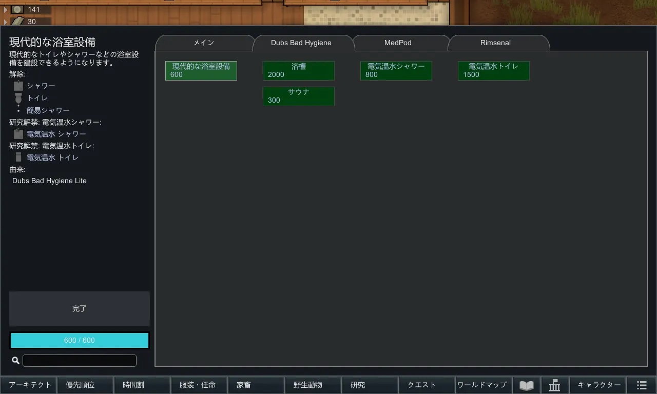 トイレや入浴や衛生関連の欲求と心情への影響を追加します。