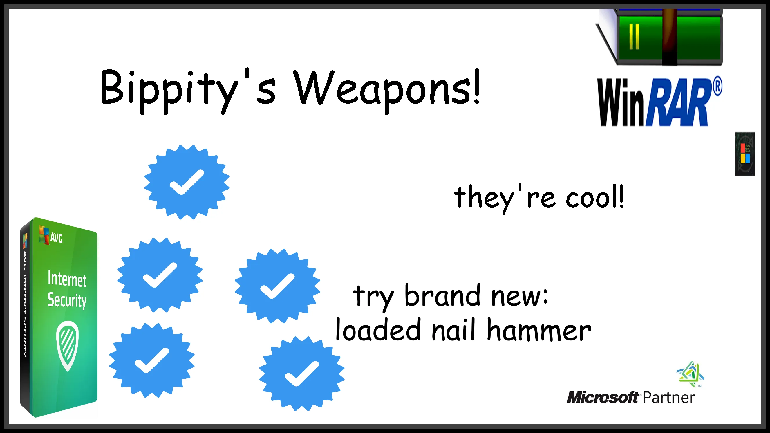 For anyone wondering, the concept of the Loaded Nail Hammer is from the youtube video [url=https://www.youtube.com/watch?v=Lti_zl3MnT4] "I Made the World's Most Powerful Hammer!" [/url]