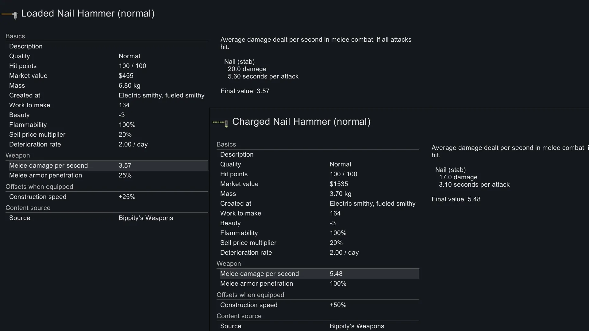 The Charged Nail Hammer deals less damage than the Loaded, but has a higher armor piercing bonus and "reloads" faster. Also grants +50% Construction Speed.