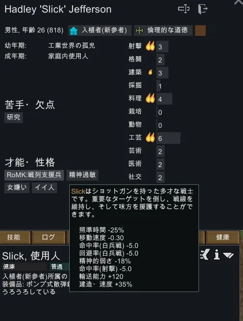 -ポーンが間違ったクラスのアビリティを持っているバグは、ポーンの生成に問題があります。通常、EdB Prepare CarefullyのようなキャラクターエディターModが原因です。これらは当Modとの相性が悪いというより、RoM全般との相性が悪いのです。セーブしてリロードすると、問題が解決することがあります。他の方法としては、開発者モードを使って手動でクラスを取り除き、好きなクラスを与え直すことができます。また、(Godmodeにした後で出現する)Reset Classボタンを押すことでも解決する場合があります。