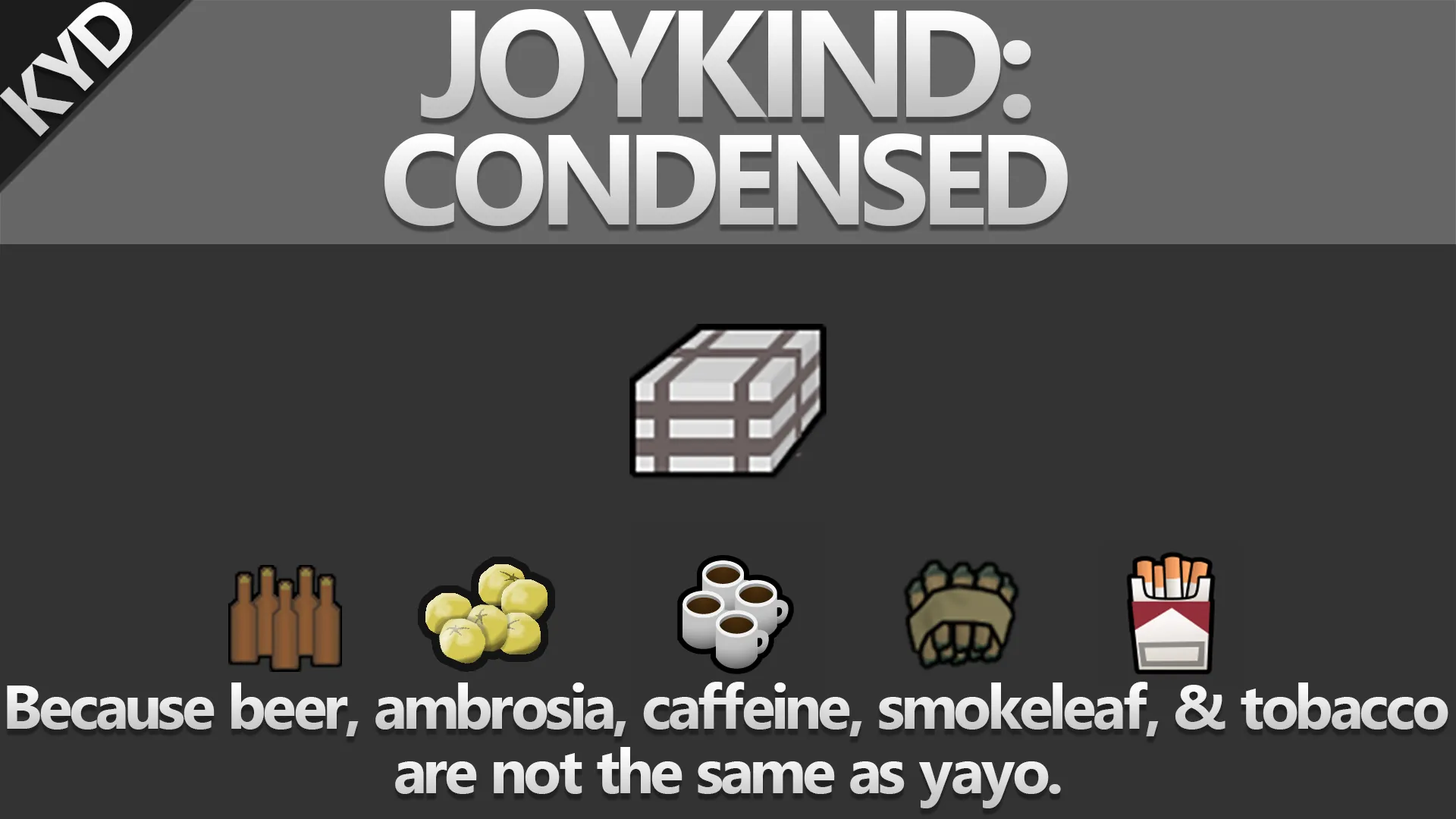 [b]Easier:[/b] Drugs using the chemicals Alcohol, Ambrosia, Caffeine, Smokeleaf, Tobacco, or Nicotine have been moved into their own JoyKind and JoyGiver, meaning pawns can sit back, relax, and snort a line of yayo while drinking a beer, munching on some rare fruit, downing a coffee, lighting up a joint, and smoking a cigar after spending 16 hours digging out a new warehouse from the mountainside, without wasting recreation points.
