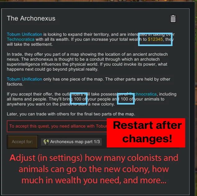 Allows user to adjust parameters of Archonexus quest on the mod settings. This is continued from NilchEi with permission.