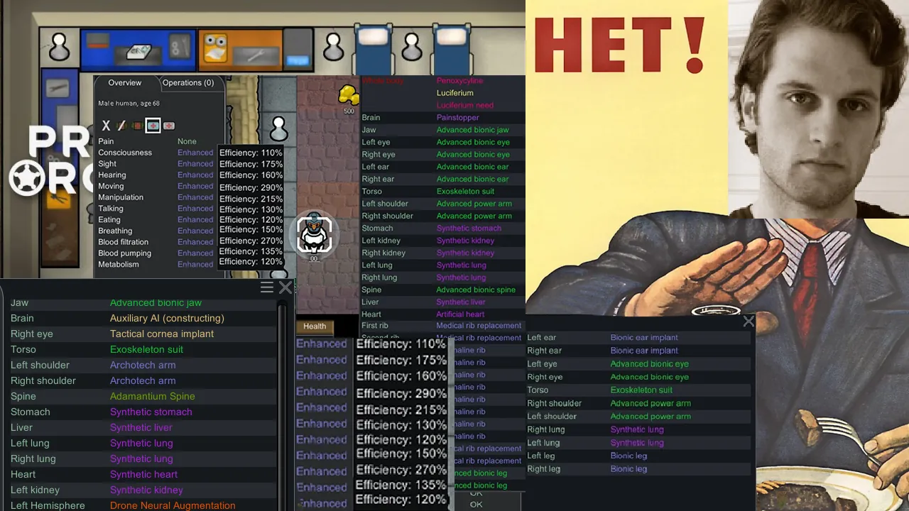 The properties of the body parts are identical to those of core Rimworld bionics. Unlike other medical mods, such as RBSE and EPOE, no liberties were taken by adding extra stat modifiers or cheaper recipes than those in Core. The lung and kidney cost as much as the Bionic Stomach, the liver as much as the Bionic Heart and the jaw costs as much as the Bionic Eye. Unlike other medical mods, no core Rimworld Defs were altered whatsoever.
