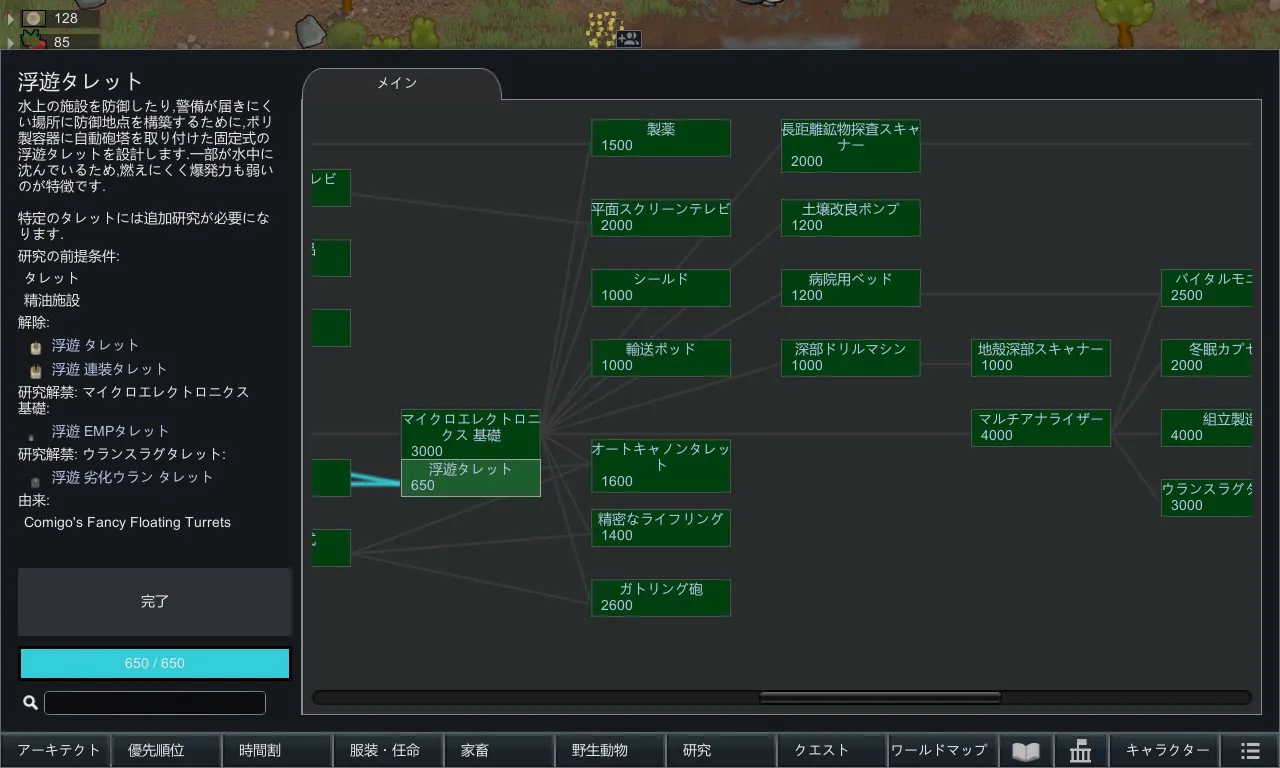 全ての建築物には「浮遊タレット」の研究を完了させる必要があります。バイオ液化燃料製のポリエステル製のフロート容器にタレットを取り付けて水上に浮かせるため、この研究には「精油施設」と「タレット」の前提研究を完了させる必要があります。
