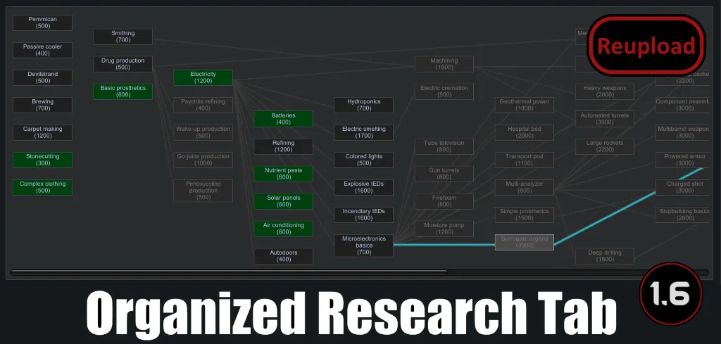 - Also check out [url=https://steamcommunity.com/sharedfiles/filedetails/?id=3217216445]OrganizedResearchTech[/url] by TheCakeIsALie. It reduces the amount of tabs and organizes reseach by tech-level.