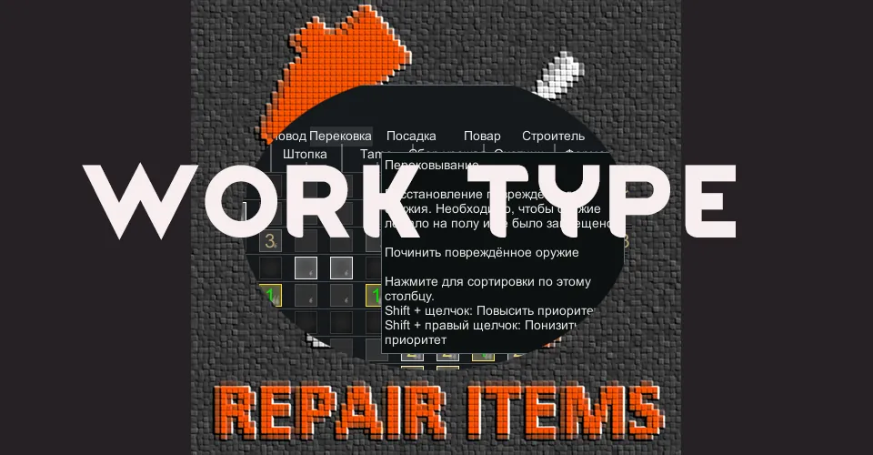 Repair Items Work Type добавляет отдельные типы работ для починки одежды и починки оружия, добавляемых в моде Repair Items.