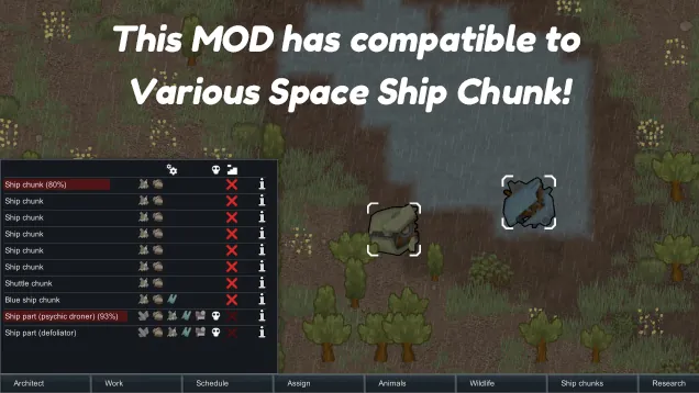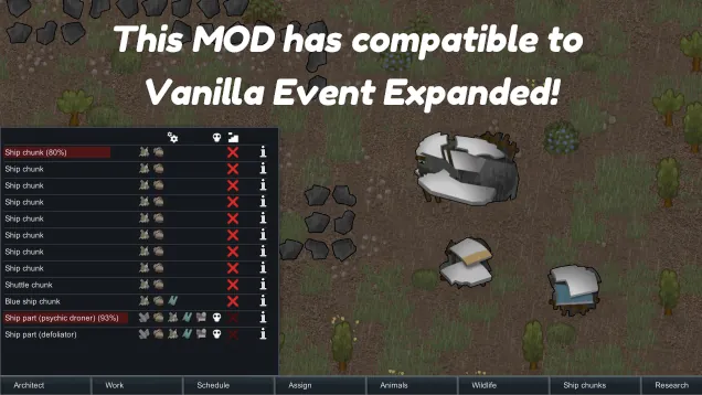 This MOD add a new tab that list-up all ship chunks in the map. You could those from its tab what look the location, check the potential dangerous and designate deconstruction. This MOD has compatible as standard to Vanilla Event Expanded and Various Space Ship Chunk.
