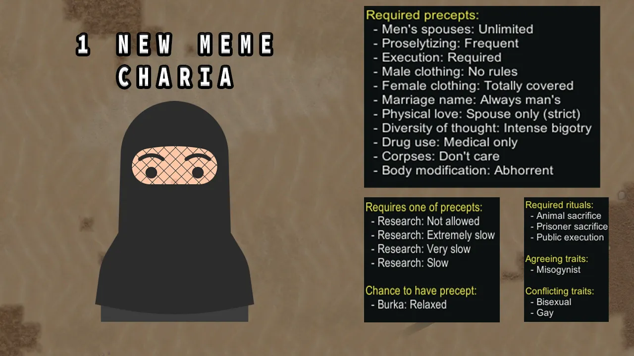[url=https://steamcommunity.com/sharedfiles/filedetails/?id=2559533848]More precepts[/url] : Alcohol forbidden with Charia.