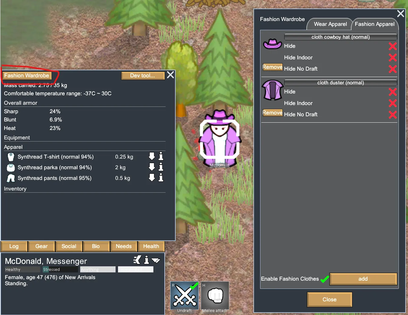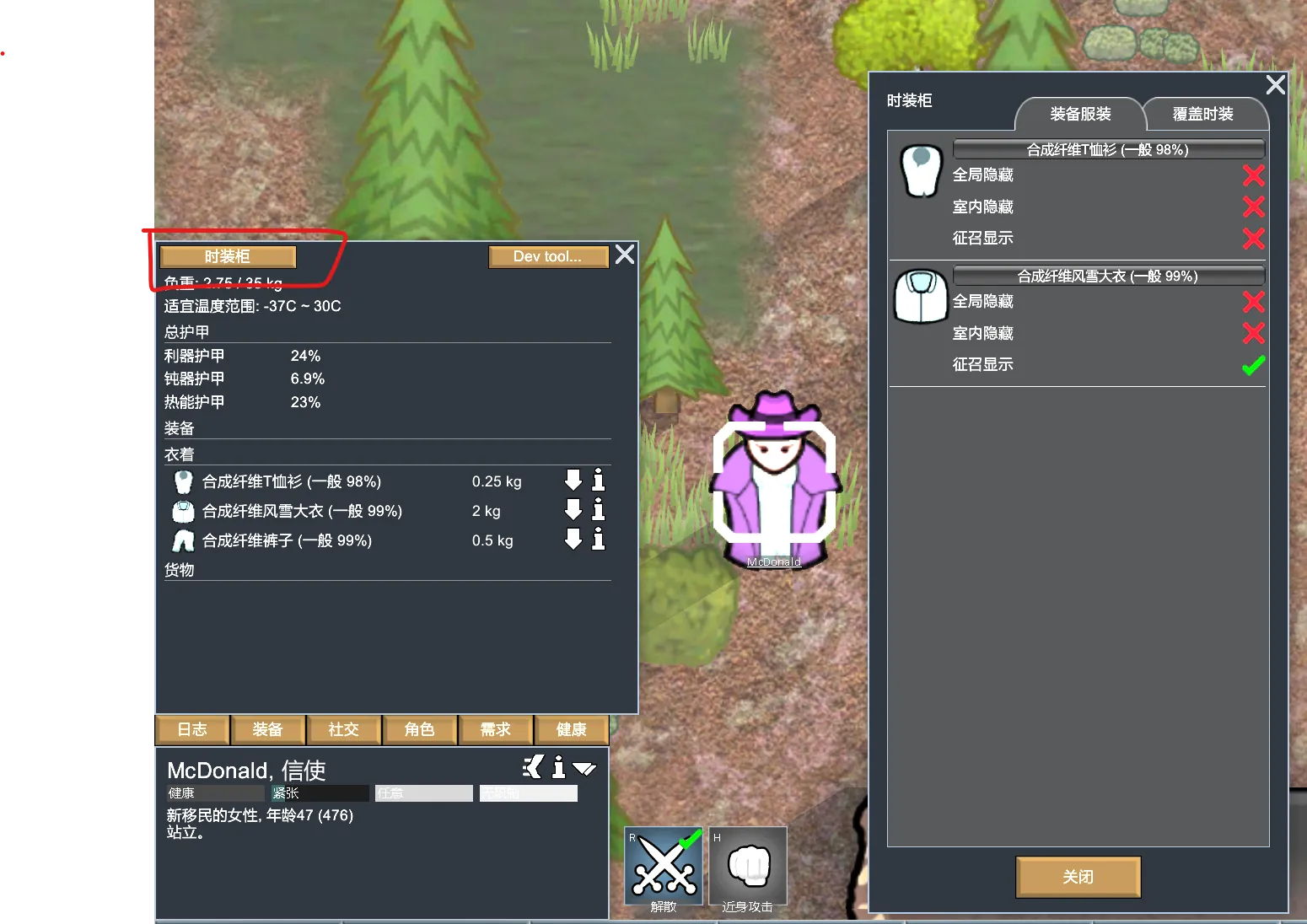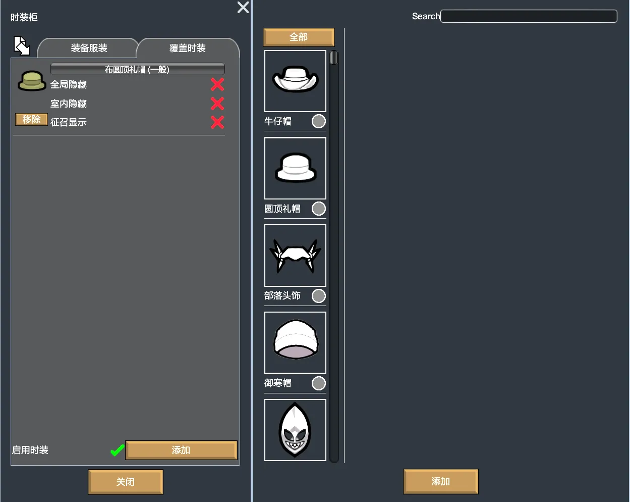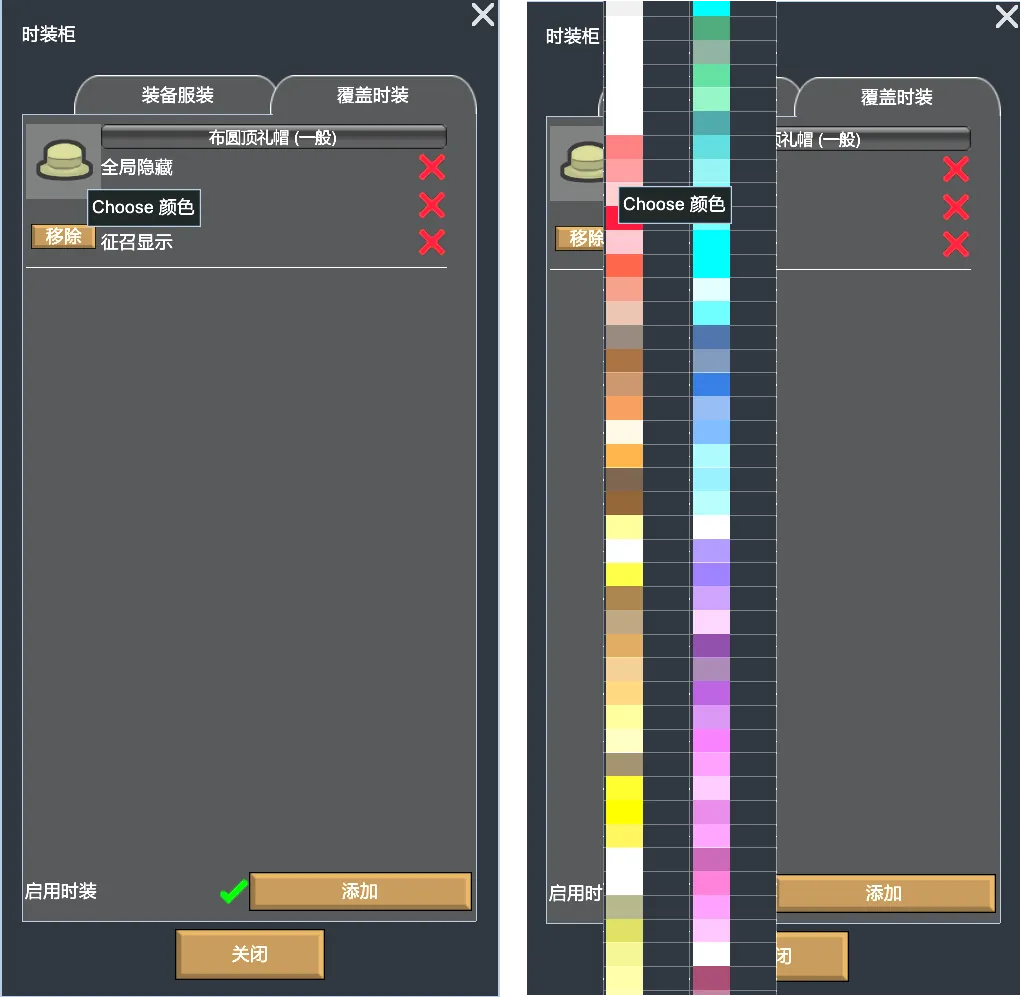 Add a button in the equipment bar, click to open the clothing wardrobe to customize the clothing display and add fashion; Fashion can overlay the original clothing image;Just support the vanilla humans for now;