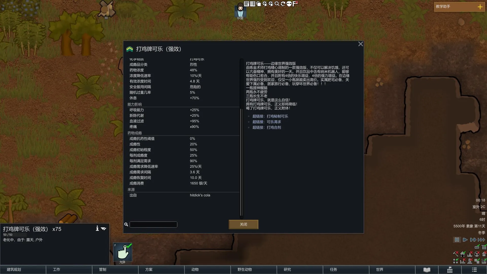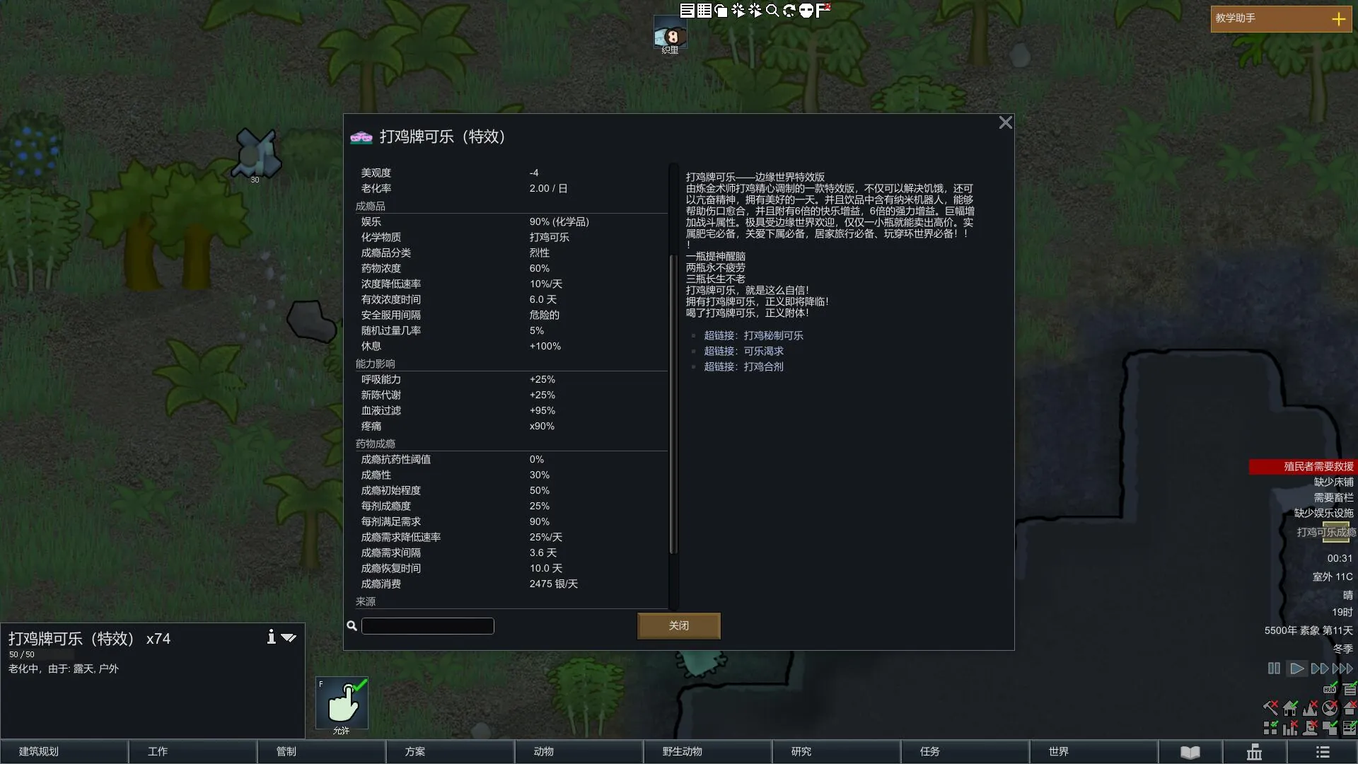 共有三种打鸡秘制可乐(普通版、强效版和特效版),三种可乐增益效果不同,但增益效果越强,可能面临的成瘾越高。一旦发生戒断反应,会让小人陷入疯狂,所以使用时一定要注意库存及产量情况。