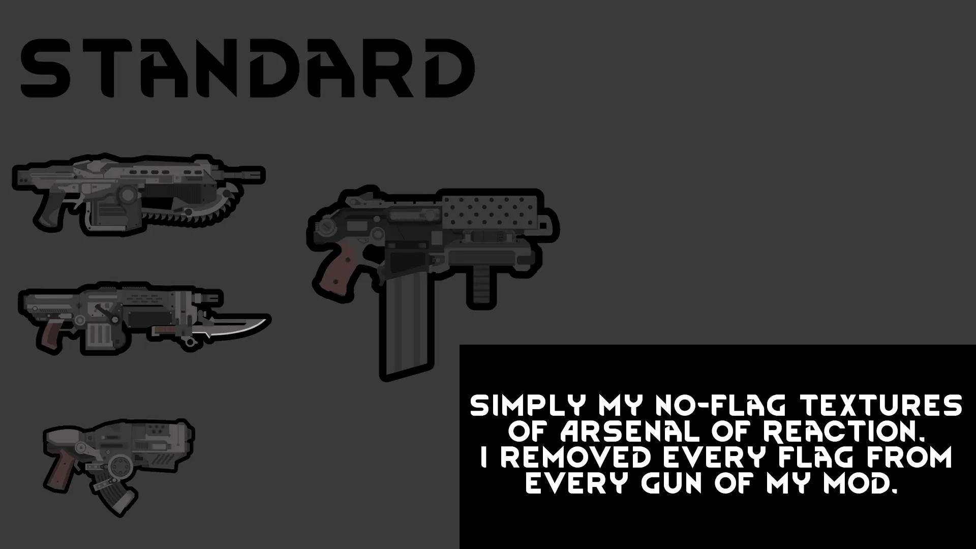 Mostly the originally Arsenal of Reaction skins. If you don't like the falg, I've added a noflag patch into the mod folders.