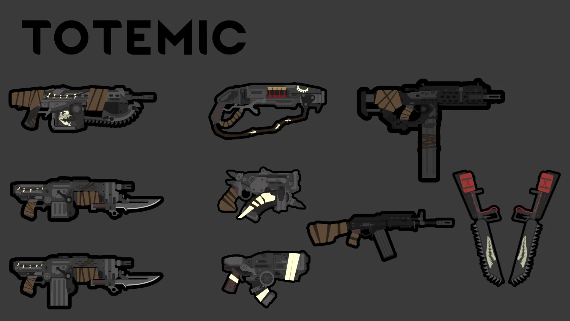 Some triballike reskins for my weapons with a lot of patchleather, bones and teeth.