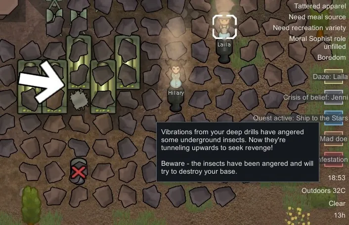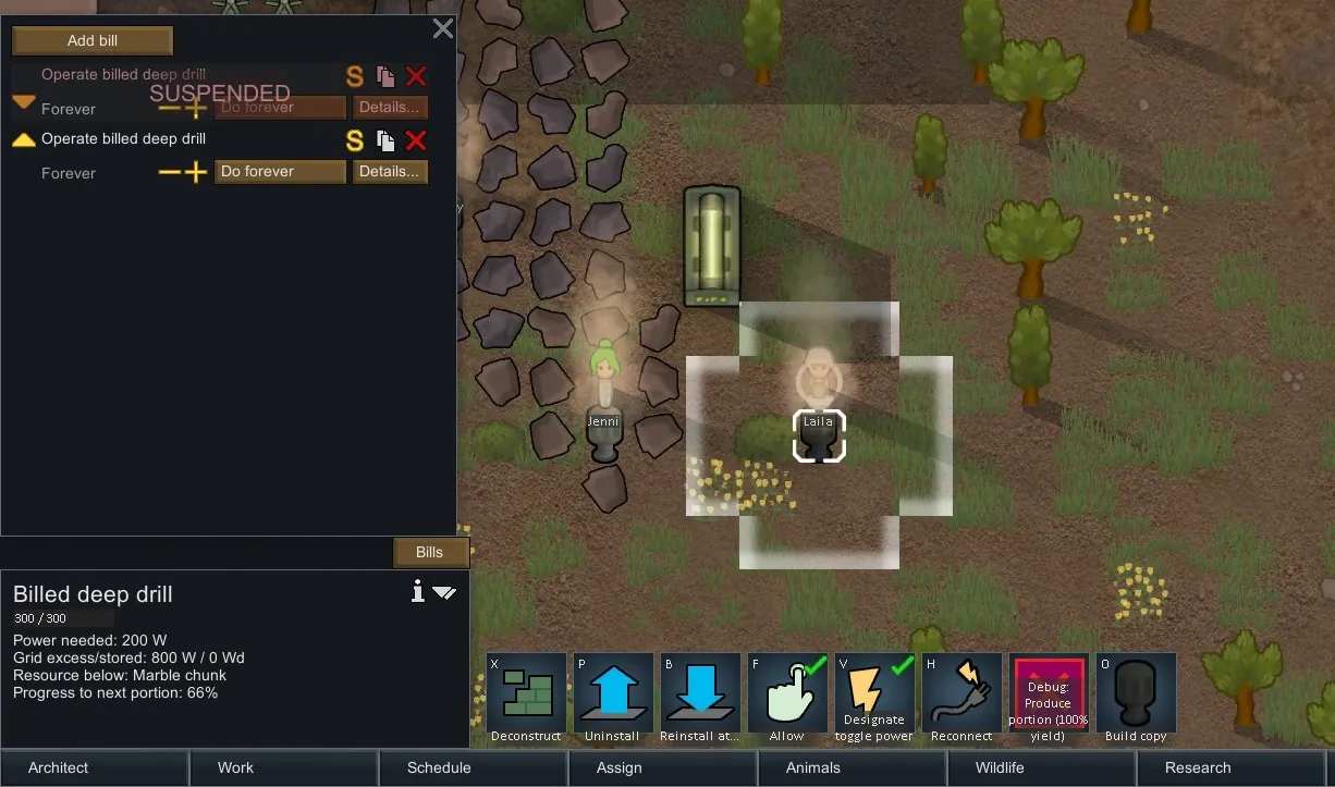 The haul options for bill do not mean anything here. So "Do X times", "Do until you have X" will not work. Neither does "Haul to stockpile". Billed drill can give mining exp and trigger infestations, as expected. This shares the same infestation mechanism with the vanilla drill.