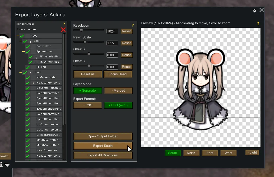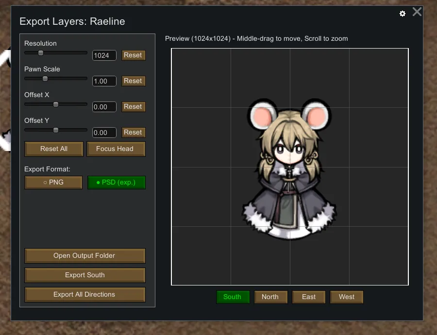 It decomposes and exports the selected pawn's image into individual layers. You can choose the output format from either .png or .psd