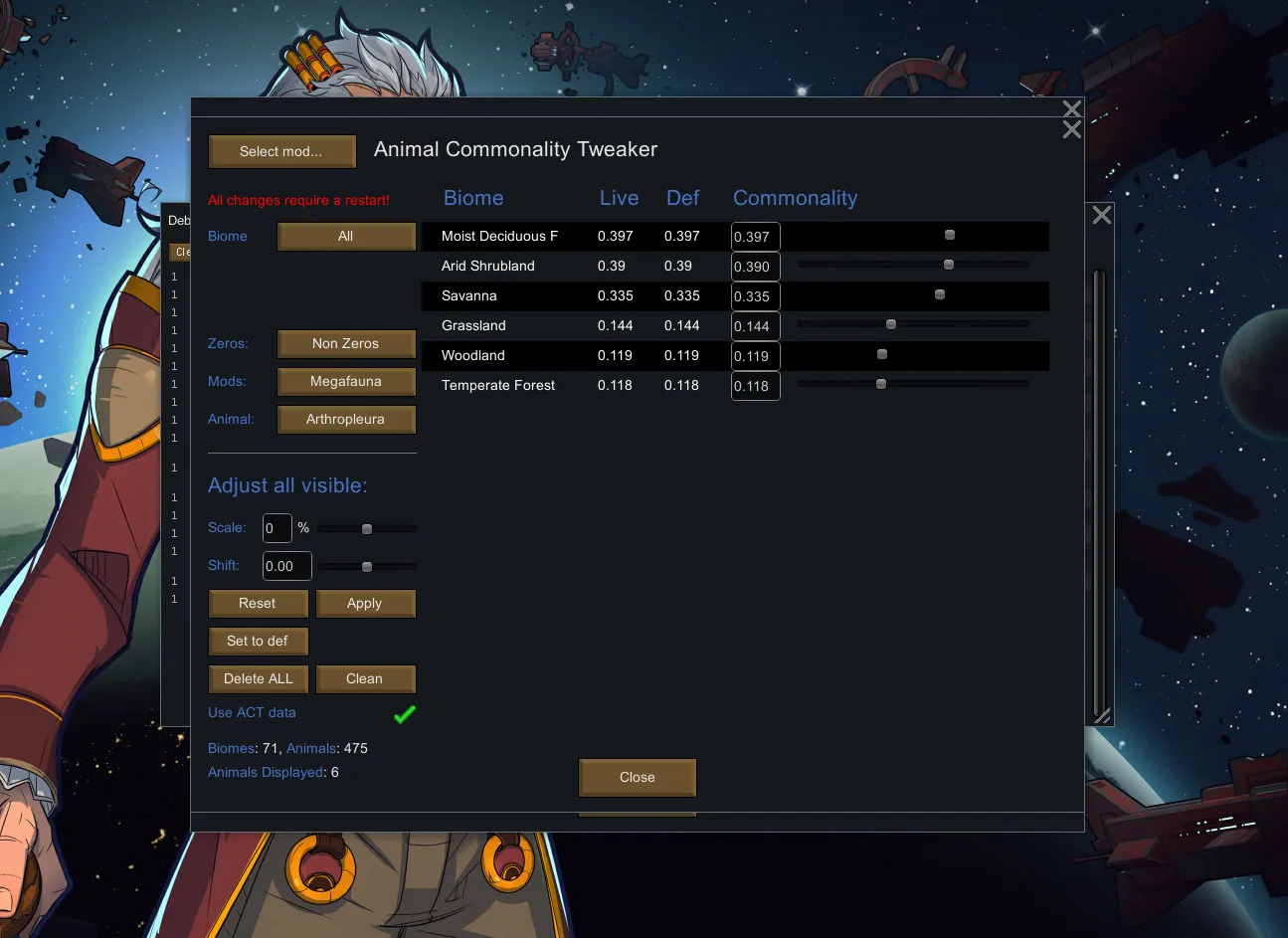 Hopefully what the controls do is clear. Clicking on the column titles sorts the animals. You can see what is live with the "Live" value. I was surprised by how much mods fiddle around with other data, even the animal density for core.