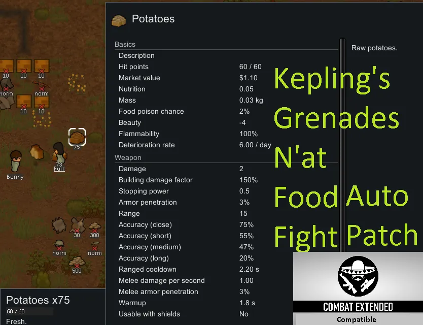 Food auto fight patch, makes all items that use ParentName="PlantFoodRawBase" throwable weapons, your results may vary. This is a stand alone mod in the GNAT series.