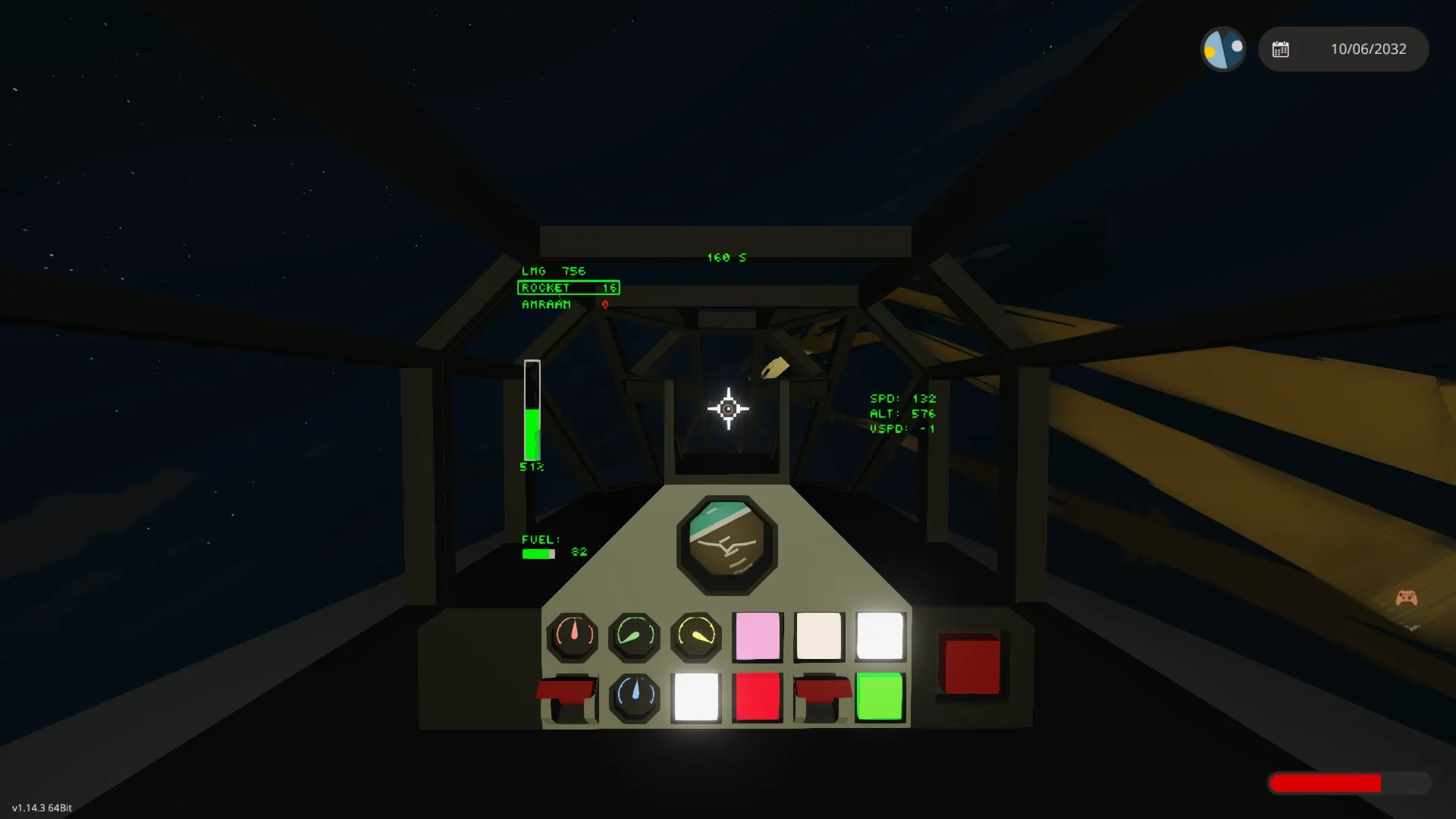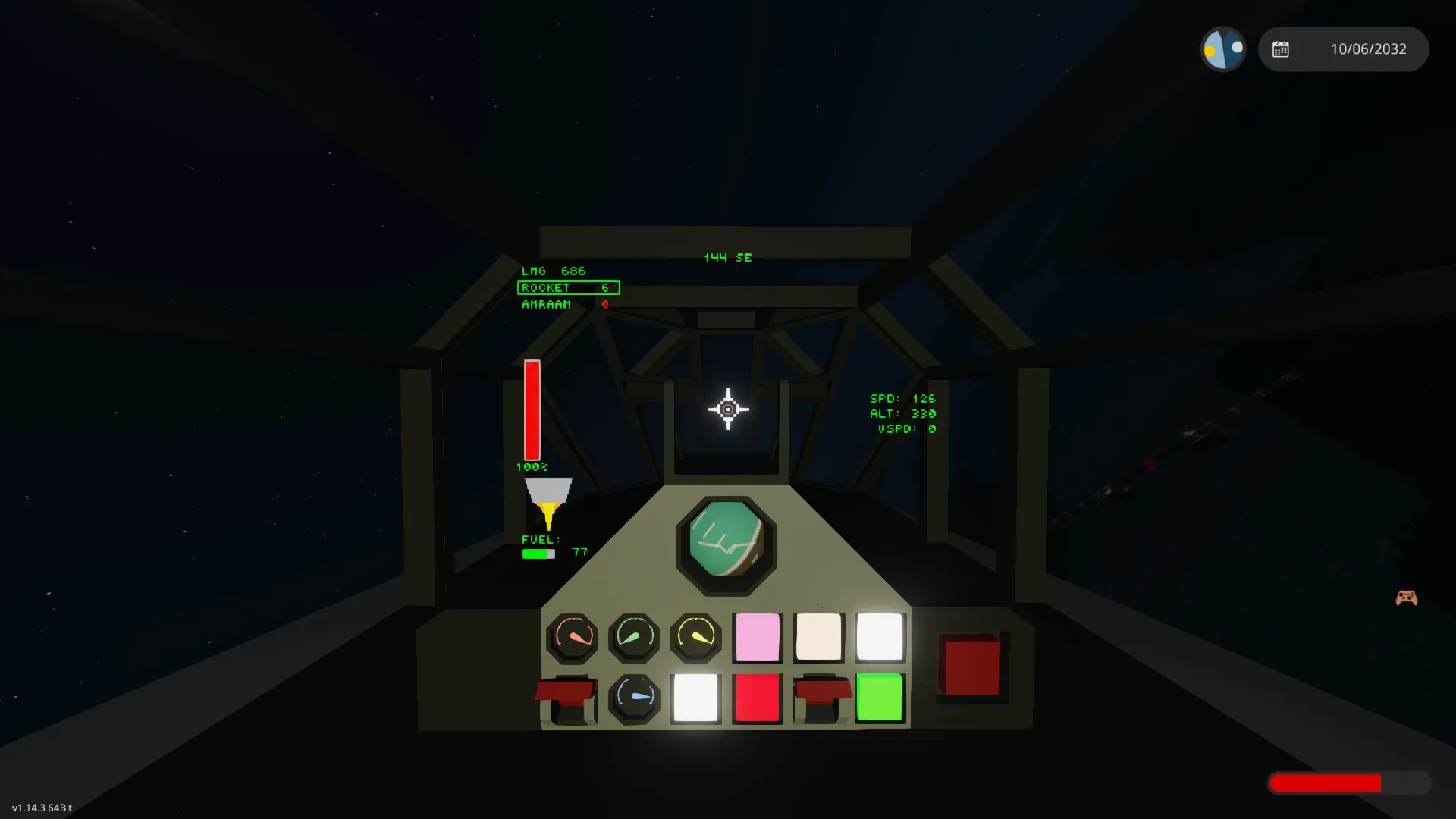 Instrument panels: toggle engine, Taxi Lights, Dashboard Lights/Cockpit Lights, Strobe Lights, Arm Guns, Arm Ordinance, Stabilizer (custom, not gyro), Activate Cross-hair, Landing Lights.