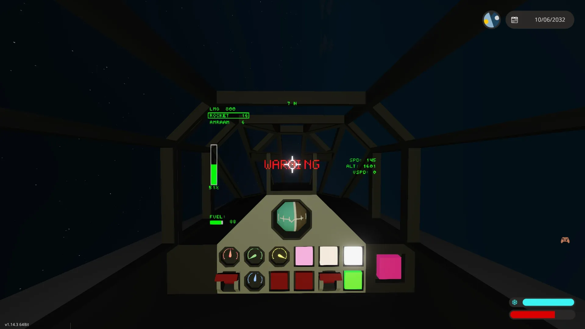 Helmet HUD with Throttle, Fuel, Speed, Altitude, Vertical Speed, Ammo, Weapon Selector, Heading, And Afterburner Visualization.