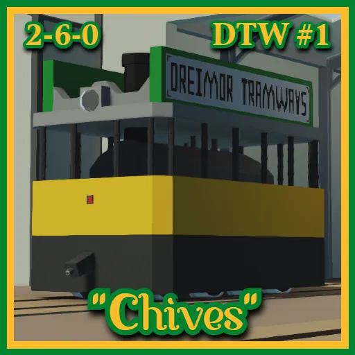 The Dreimor Tramway used two fireless trams on their line from their opening till their closure. The two trams, samed Chives and Sage respectively, would ferry people and goods from the island of Donkk to Terminal Camodo and all the places in between. "Chives" was the first of the two, outshopped in 1905 and worked without incident for their whole working life, pulling passengers up and down the line in their special coach.
