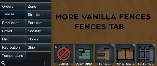 By popular request, this mod adds an architect menu tab specifically for the vanilla fences and the fences in More Vanilla Fences, so as to keep the Structure architect menu relatively uncluttered.