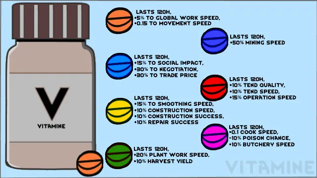 Simple mod to add vitamins to the game to give your pawns work related buffs.