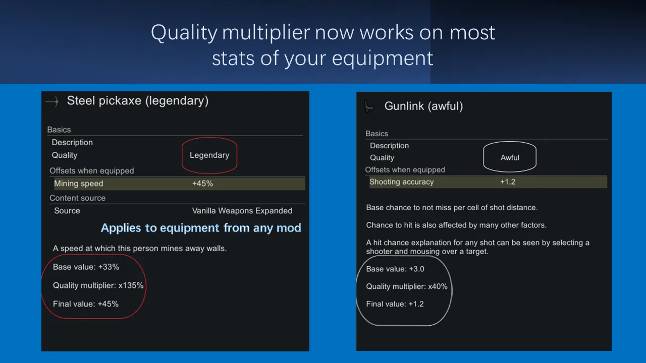 Enables Quality multiplier to influence most stats and buffs of items. Epic tools and equipment now match their names