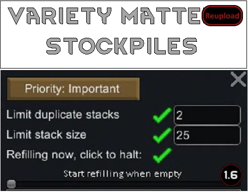 [b]Limit Duplicate Stacks:[/b] Limit the number of stacks of the same item that can be stored in a stockpile. For example, with a duplicate limit of 2, pawns will never store more than 2 stacks of corn, no matter how large the stockpile.