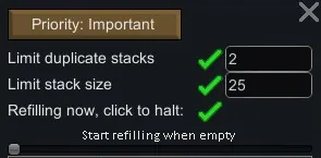 [*] Refill Limit: Recommended to keep set to always fill. Moving the slider works, but will substantially reduce the usefulness of deep storage.